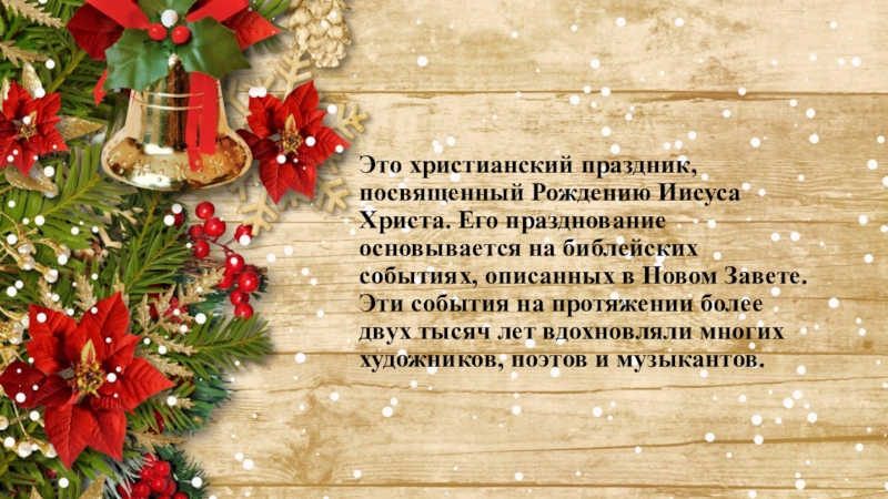 Это христианский праздник, посвященный Рождению Иисуса Христа. Его празднование основывается на библейских событиях, описанных в Новом Завете. Эти события на протяжении более двух тысяч лет вдохновляли многих художников, поэтов и музыкантов.
