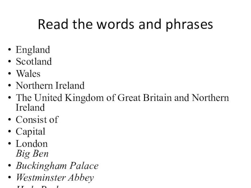 Read the words and phrasesEngland Scotland WalesNorthern IrelandThe United Kingdom of Great Britain and Northern IrelandConsist ofCapital