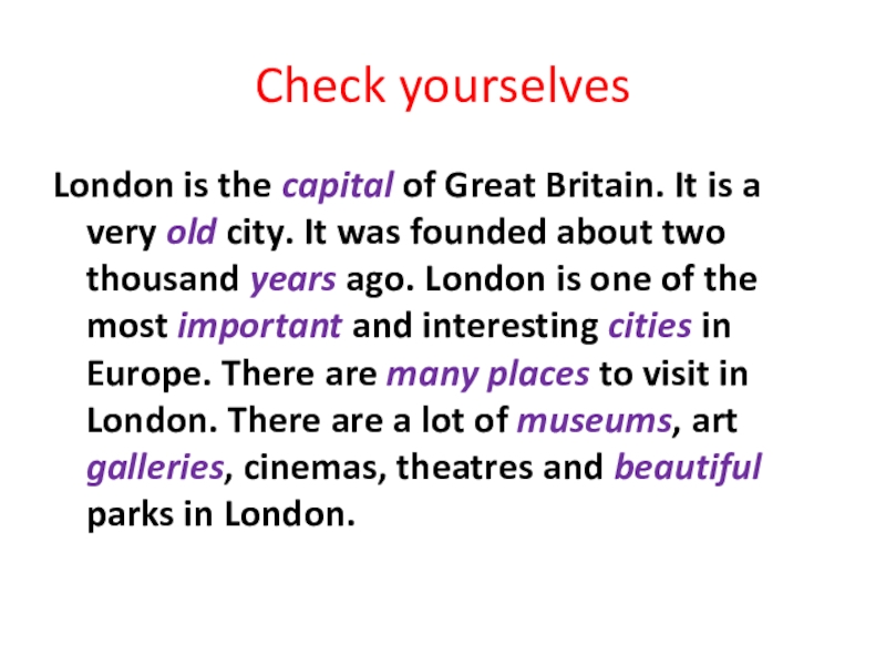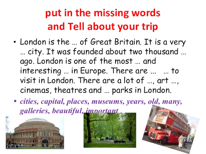 the … of Great Britain. It is a very … city. It was founded about two thousand … ago. London is one of the most … and interesting … in Europe. There are ... … to visit in London. There are a lot of …, art …, cinemas, theatres and … parks in London.