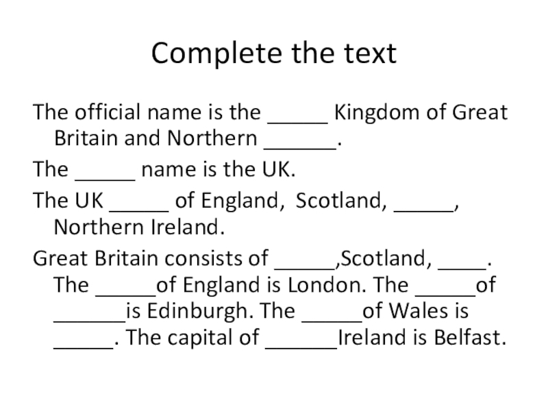 Complete the text The official name is the _____ Kingdom of Great Britain and Northern ______.The _____