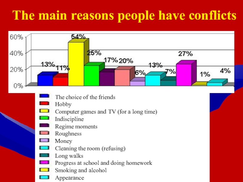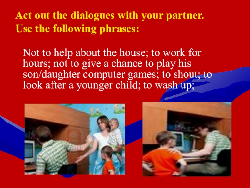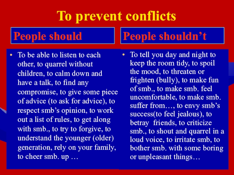 To tell you day and night to keep the room tidy, to spoil the mood, to threaten or frighten (bully), to make fun of smb., to make smb. feel uncomfortable, to make smb. suffer from…, to envy smb’s success(to feel jealous), to betray friends, to criticize smb., to shout and quarrel in a loud voice, to irritate smb, to bother smb. with some boring or unpleasant things…