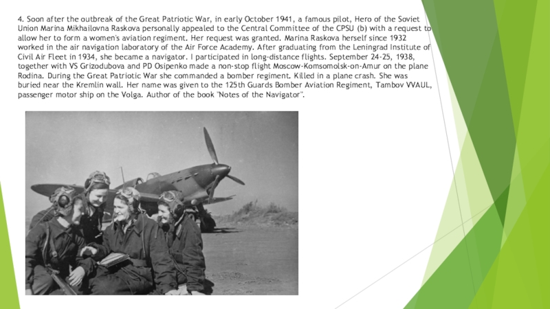early October 1941, a famous pilot, Hero of the Soviet Union Marina Mikhailovna Raskova personally appealed to the Central Committee of the CPSU (b) with a request to allow her to form a women's aviation regiment. Her request was granted. Marina Raskova herself since 1932 worked in the air navigation laboratory of the Air Force Academy. After graduating from the Leningrad Institute of Civil Air Fleet in 1934, she became a navigator. I participated in long-distance flights. September 24-25, 1938, together with VS Grizodubova and PD Osipenko made a non-stop flight Moscow-Komsomolsk-on-Amur on the plane Rodina. During the Great Patriotic War she commanded a bomber regiment. Killed in a plane crash. She was buried near the Kremlin wall. Her name was given to the 125th Guards Bomber Aviation Regiment, Tambov VVAUL, passenger motor ship on the Volga. Author of the book "Notes of the Navigator".