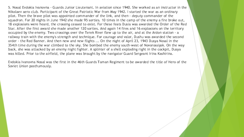 Слайд 65. Nosal Evdokia Ivanovna - Guards Junior Lieutenant. In aviation since