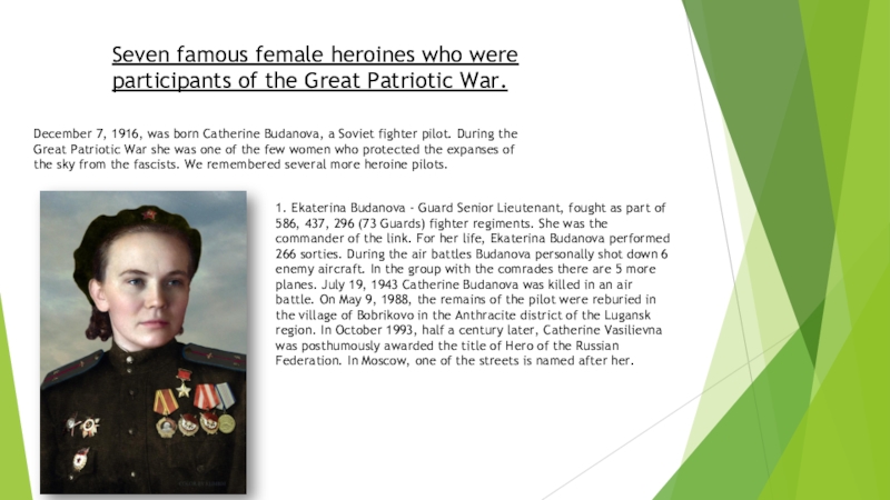1. Ekaterina Budanova - Guard Senior Lieutenant, fought as part of 586, 437, 296 (73 Guards) fighter regiments. She was the commander of the link. For her life, Ekaterina Budanova performed 266 sorties. During the air battles Budanova personally shot down 6 enemy aircraft. In the group with the comrades there are 5 more planes. July 19, 1943 Catherine Budanova was killed in an air battle. On May 9, 1988, the remains of the pilot were reburied in the village of Bobrikovo in the Anthracite district of the Lugansk region. In October 1993, half a century later, Catherine Vasilievna was posthumously awarded the title of Hero of the Russian Federation. In Moscow, one of the streets is named after her.
