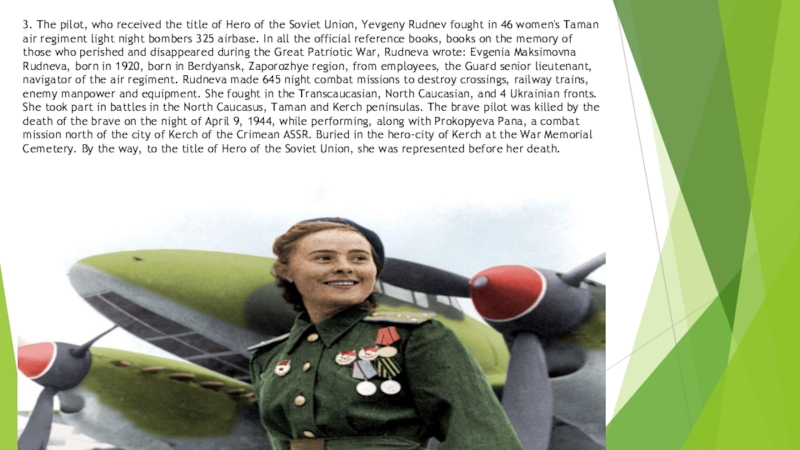 Soviet Union, Yevgeny Rudnev fought in 46 women's Taman air regiment light night bombers 325 airbase. In all the official reference books, books on the memory of those who perished and disappeared during the Great Patriotic War, Rudneva wrote: Evgenia Maksimovna Rudneva, born in 1920, born in Berdyansk, Zaporozhye region, from employees, the Guard senior lieutenant, navigator of the air regiment. Rudneva made 645 night combat missions to destroy crossings, railway trains, enemy manpower and equipment. She fought in the Transcaucasian, North Caucasian, and 4 Ukrainian fronts. She took part in battles in the North Caucasus, Taman and Kerch peninsulas. The brave pilot was killed by the death of the brave on the night of April 9, 1944, while performing, along with Prokopyeva Pana, a combat mission north of the city of Kerch of the Crimean ASSR. Buried in the hero-city of Kerch at the War Memorial Cemetery. By the way, to the title of Hero of the Soviet Union, she was represented before her death.