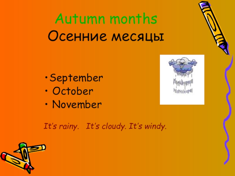 Autumn months Осенние месяцы September October NovemberIt’s rainy.  It’s cloudy. It’s windy.