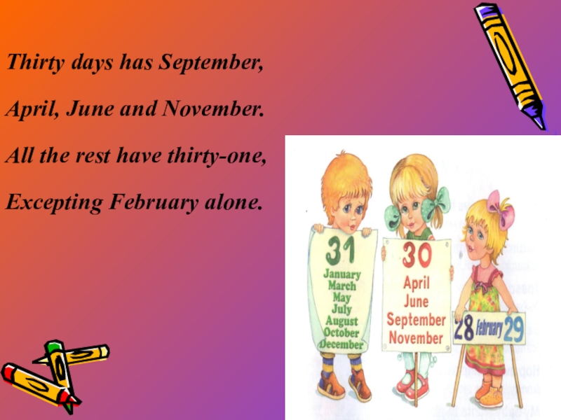 Thirty days has September, April, June and November.All the rest have thirty-one, Excepting February alone.