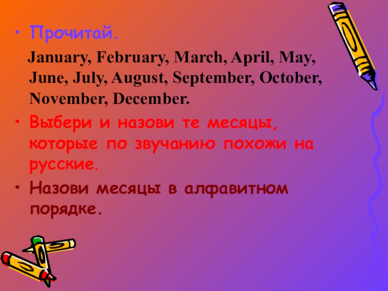 Прочитай.  January, February, March, April, May, June, July, August, September, October, November, December.Выбери и назови те