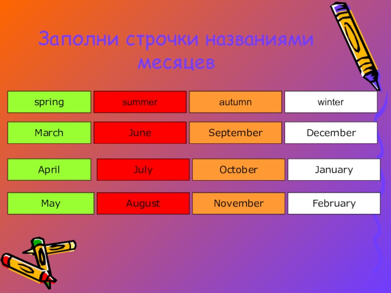 Заполни строчки названиями месяцевMarchAprilMayspringsummerJuneJulyAugustautumnSeptemberOctoberNovemberwinterDecemberJanuaryFebruary