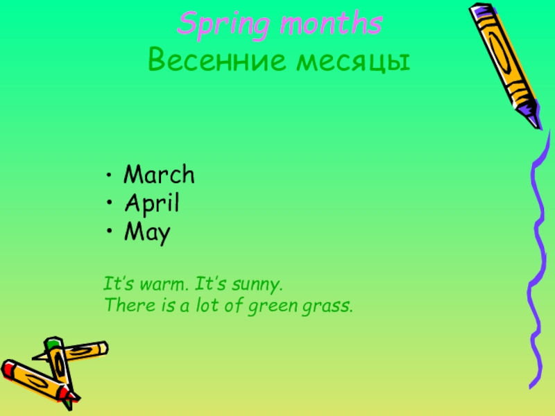 Spring months Весенние месяцы March April MayIt’s warm. It’s sunny. There is a lot of green grass.
