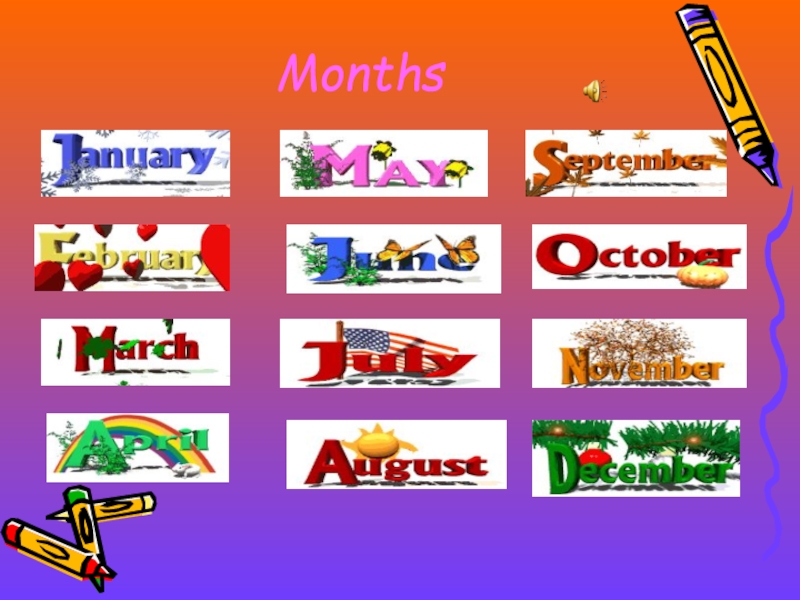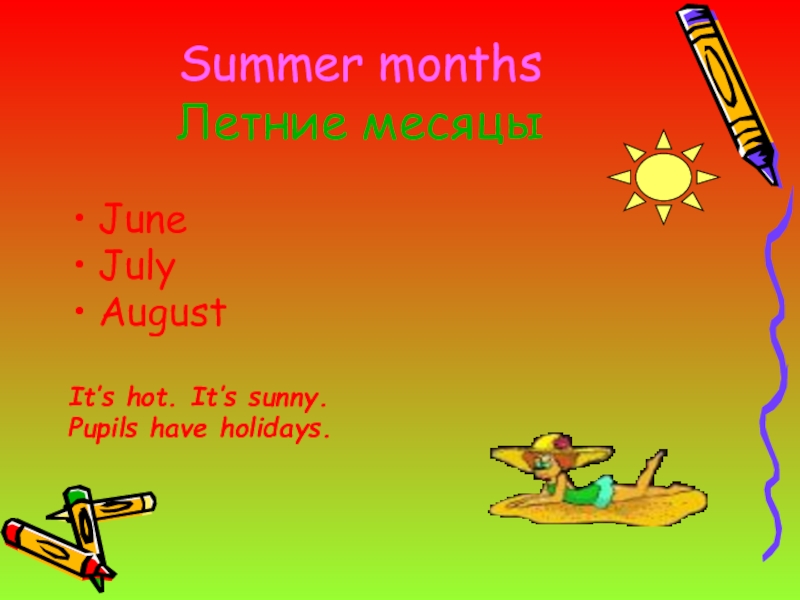 Summer months Летние месяцыJuneJulyAugustIt’s hot. It’s sunny. Pupils have holidays.