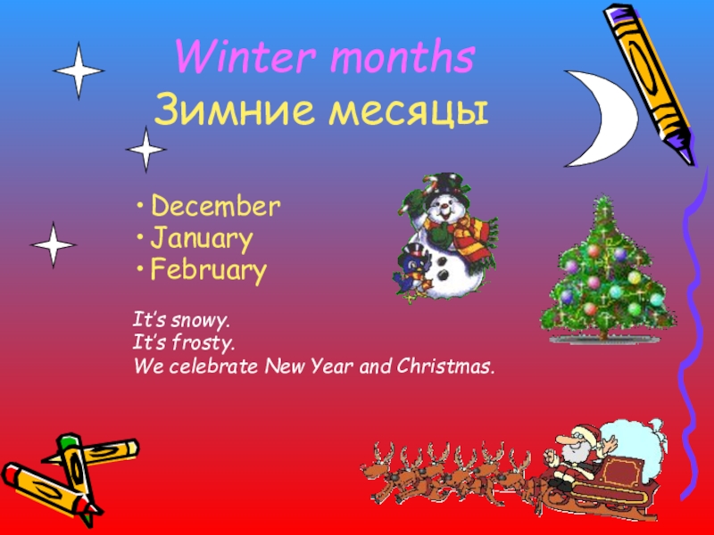 Winter months Зимние месяцыDecemberJanuaryFebruaryIt’s snowy. It’s frosty.We celebrate New Year and Christmas.