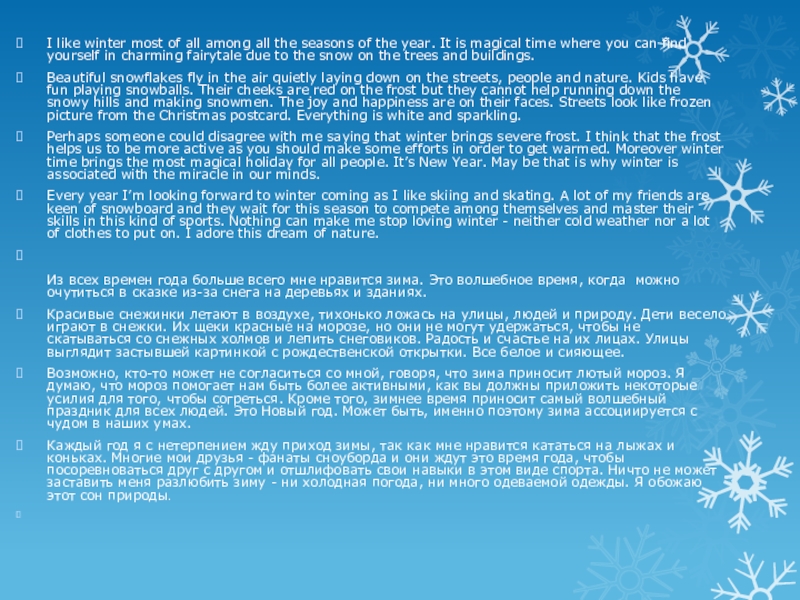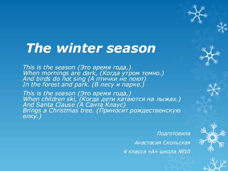 This is the season (Это время года,) When children ski, (Когда дети катаются на лыжах.) And Santa Clause (А Санта Клаус) Brings a Christmas tree. (Приносит рождественскую елку.)