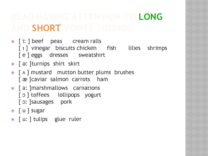 READ PAYING ATTENTION TO LONG AND SHORT VOWEL SOUNDS:[ i: ] beef    peas      cream ralls  [ ı ]  vinegar   biscuits chicken      fish       lilies    shrimps    [ e ] eggs    dresses      sweatshirt [ ə: ]turnips  shirt  skirt[ ʌ ] mustard   mutton butter plums  brushes  [ æ ]caviar  salmon  carrots    ham     [ a: