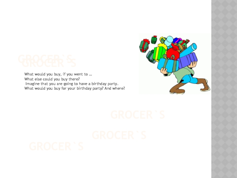 GROCER`S  What would you buy, if you went to … What else could you buy there?  Imagine that you are going to have a birthday party. What would you buy for your birthday party? And where? GROCER`S  GROCER`S  GROCER`S  GROCER`S