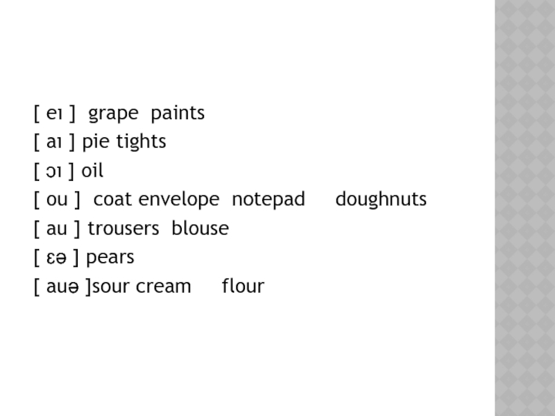 [ eı ]  grape  paints     [ aı ] pie tights[ ɔı ] oil [ ou ]  coat envelope  notepad     doughnuts [ au ] trousers  blouse[ ɛə ] pears[ auə ]sour cream     flour