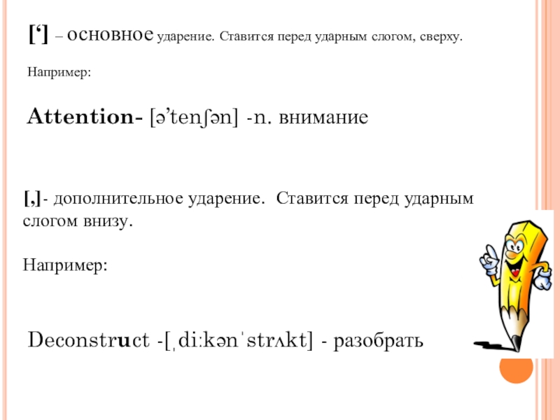 [,]- дополнительное ударение. Ставится перед ударным слогом внизу.