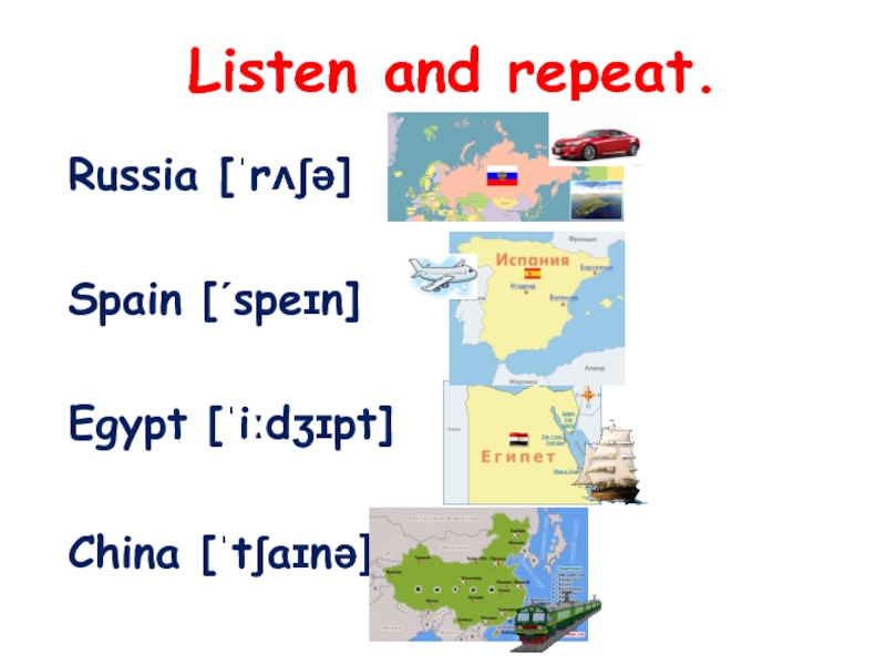 Listen and repeat.Russia [ˈrʌʃə] Spain [ˊspeɪn]Egypt [ˈiːdʒɪpt]China [ˈtʃaɪnə]
