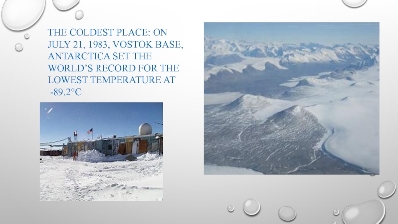 Слайд 8THE COLDEST PLACE: ON JULY 21, 1983, VOSTOK BASE, ANTARCTICA SET