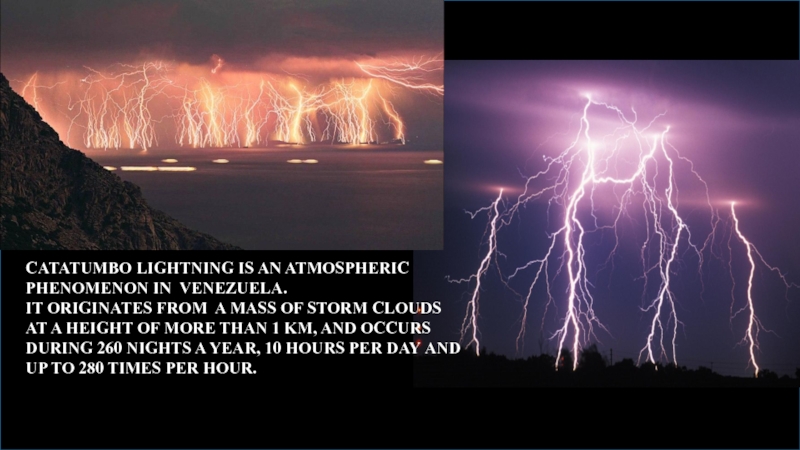 СATATUMBO LIGHTNING IS AN ATMOSPHERIC PHENOMENON IN VENEZUELA.