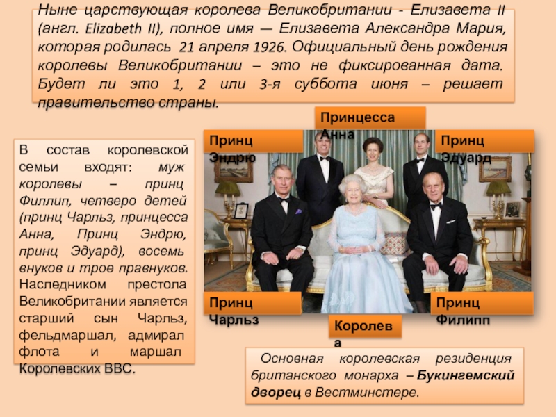 В состав королевской семьи входят: муж королевы – принц Филлип, четверо детей (принц Чарльз, принцесса Анна, Принц Эндрю, принц Эдуард), восемь внуков и трое правнуков. Наследником престола Великобритании является старший сын Чарльз, фельдмаршал, адмирал флота и маршал Королевских ВВС.