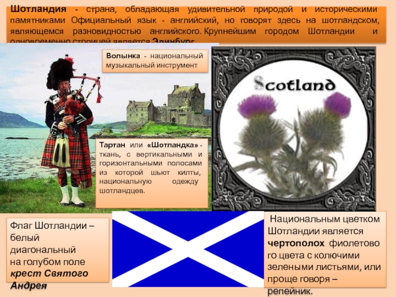 Национальным цветком Шотландии является чертополох фиолетового цвета с колючими зелеными листьями, или проще говоря – репейник.