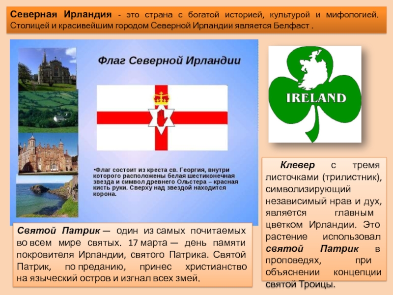 Клевер с тремя листочками (трилистник), символизирующий независимый нрав и дух, является главным цветком Ирландии. Это растение использовал святой Патрик в проповедях, при объяснении концепции святой Троицы.