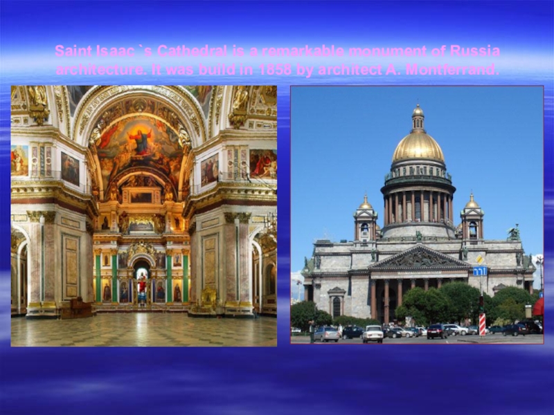 Слайд 9Saint Isaac `s Cathedral is a remarkable monument of Russia architecture.