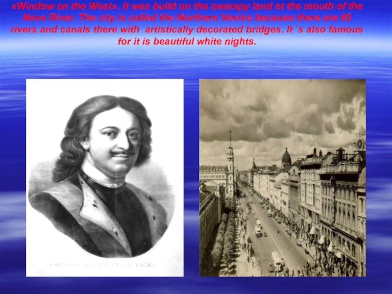 of the most beautiful cities in the world. It was founded in 1703 by Peter the Great as the «Window on the West». It was build on the swampy land at the mouth of the Neva River. The city is called the Northern Venice because there are 65 rivers and canals there with artistically decorated bridges. It `s also famous for it is beautiful white nights.