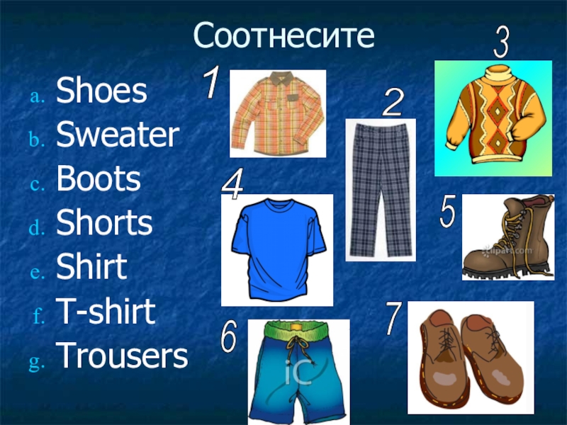 СоотнеситеShoesSweaterBootsShortsShirtT-shirtTrousers 1234567