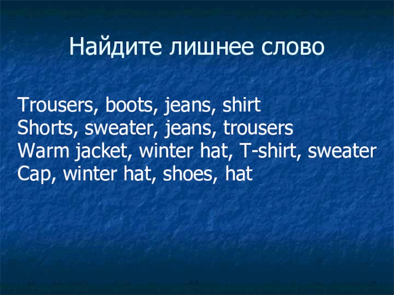Найдите лишнее словоTrousers, boots, jeans, shirtShorts, sweater, jeans, trousersWarm jacket, winter hat, T-shirt, sweaterCap, winter hat, shoes,