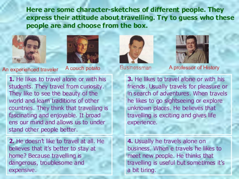 - No, you're wrong. Businessmen don't travel from curiosity.