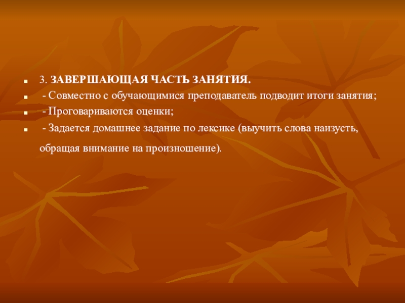 - Задается домашнее задание по лексике (выучить слова наизусть, обращая внимание на произношение).
