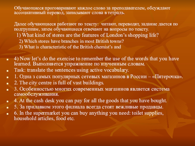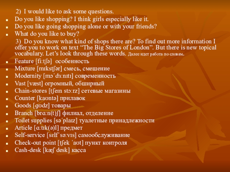 3) Do you know what kind of shops there are? To find out more information I offer you to work on text “The Big Stores of London”. But there is new topical vocabulary. Let’s look through these words. Далее идет работа по словам.