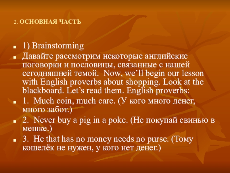 2. ОСНОВНАЯ ЧАСТЬ1) BrainstormingДавайте рассмотрим некоторые английские поговорки и пословицы, связанные с нашей сегодняшней темой. Now, we’ll