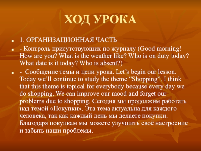 - Сообщение темы и цели урока. Let’s begin our lesson. Today we’ll continue to study the theme “Shopping”. I think that this theme is topical for everybody because every day we do shopping. We can improve our mood and forget our problems due to shopping. Сегодня мы продолжим работать над темой «Покупки». Эта тема актуальна для каждого человека, так как каждый день мы делаете покупки. Благодаря покупкам мы можете улучшить своё настроение и забыть наши проблемы.