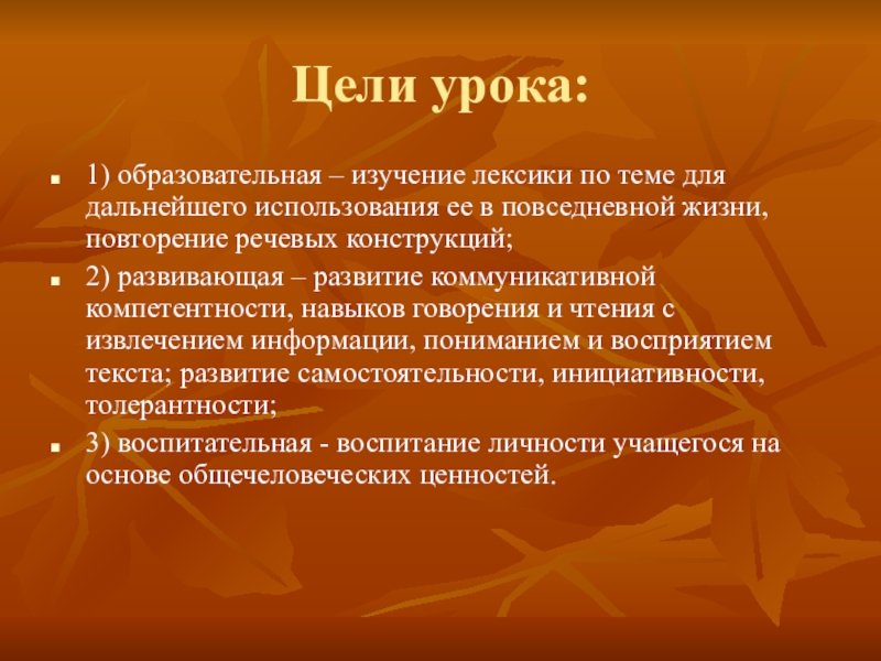 1) образовательная – изучение лексики по теме для дальнейшего использования