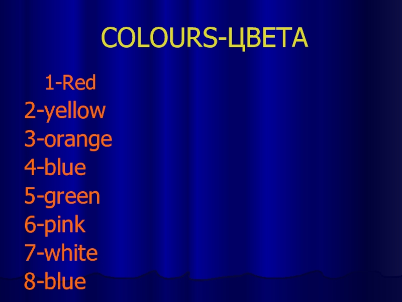 COLOURS-ЦВЕТА1-Red2-yellow3-orange4-blue5-green6-pink7-white8-bluegrey