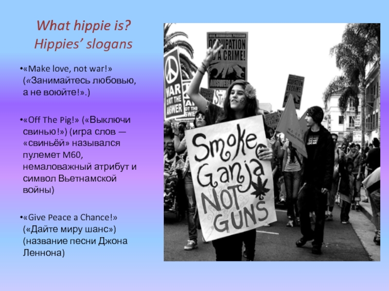 What hippie is? Hippies’ slogans«Make love, not war!» («Занимайтесь любовью, а не воюйте!».)«Off The Pig!» («Выключи свинью!») (игра слов — «свиньёй» назывался пулемет M60, немаловажный атрибут и символ Вьетнамской войны)«Give Peace a Chance!» («Дайте миру шанс») (название песни Джона