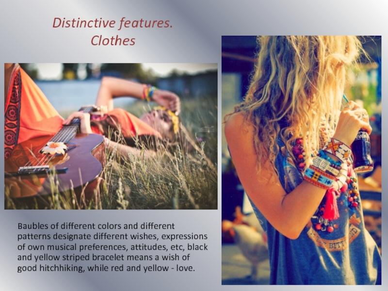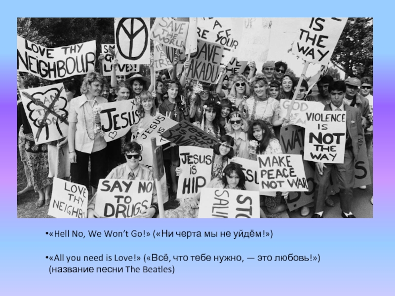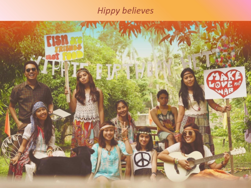 What hippie is?  Hippies’ slogans«Make love, not war!» («Занимайтесь любовью, а не воюйте!».)«Off The Pig!» («Выключи