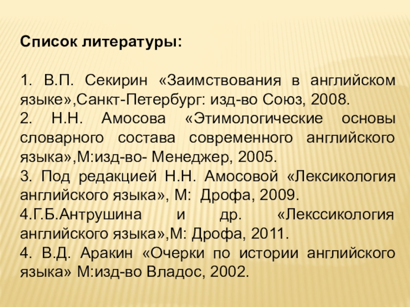 1. В.П. Секирин «Заимствования в английском языке»,Санкт-Петербург: изд-во Союз, 2008.