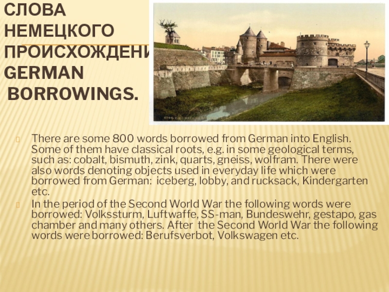 In the period of the Second World War the following words were borrowed: Volkssturm, Luftwaffe, SS-man, Bundeswehr, gestapo, gas chamber and many others. After the Second World War the following words were borrowed: Berufsverbot, Volkswagen etc.