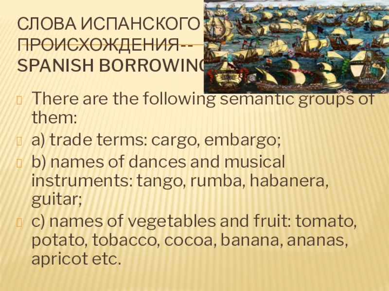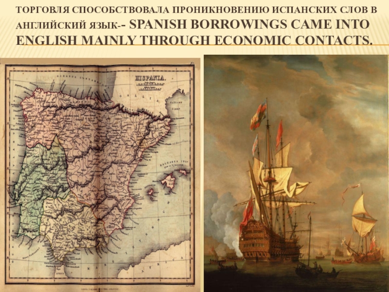 Слайд 18Торговля способствовала проникновению испанских слов в английский язык-- Spanish borrowings came