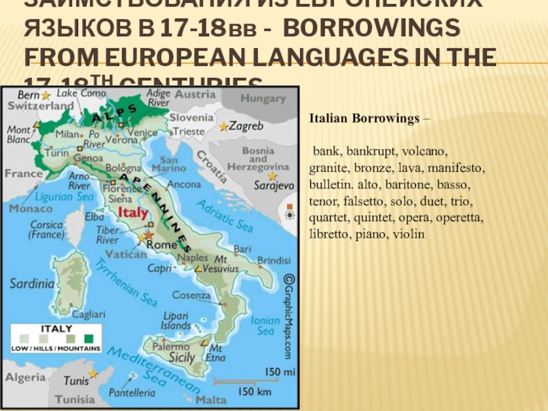 Слайд 17Заимствования из европейских языков в 17-18вв - Borrowings from European Languages