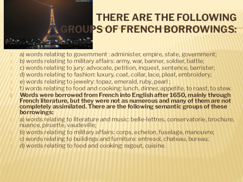 Words were borrowed from French into English after 1650, mainly through French literature, but they were not as numerous and many of them are not completely assimilated. There are the following semantic groups of these borrowings: