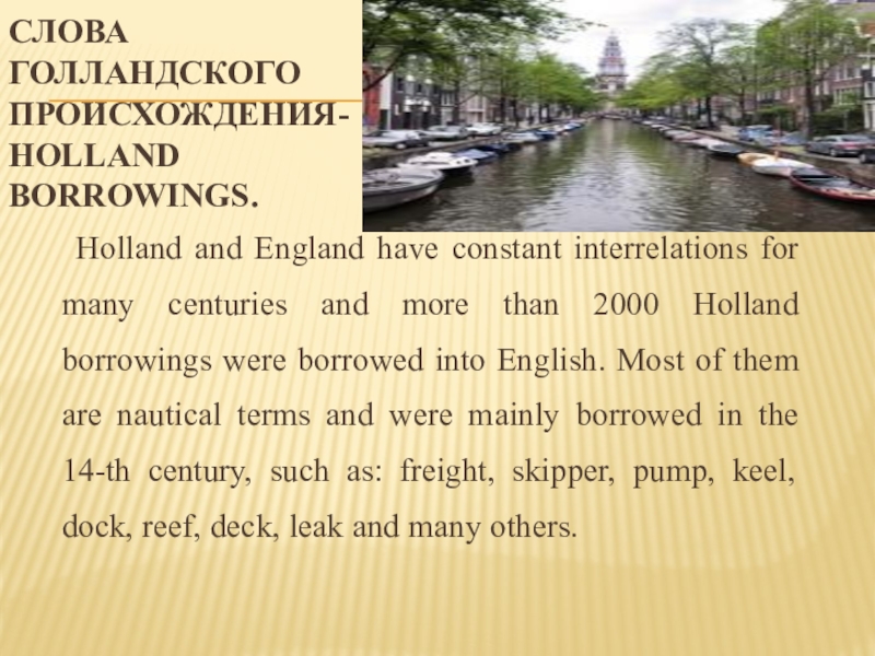 for many centuries and more than 2000 Holland borrowings were borrowed into English. Most of them are nautical terms and were mainly borrowed in the 14-th century, such as: freight, skipper, pump, keel, dock, reef, deck, leak and many others.