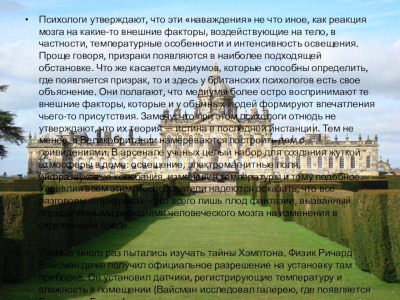 на какие-то внешние факторы, воздействующие на тело, в частности, температурные особенности и интенсивность освещения. Проще говоря, призраки появляются в наиболее подходящей обстановке. Что же касается медиумов, которые способны определить, где появляется призрак, то и здесь у британских психологов есть свое объяснение. Они полагают, что медиумы более остро воспринимают те внешние факторы, которые и у обычных людей формируют впечатления чьего-то присутствия. Замечу, что при этом психологи отнюдь не утверждают, что их теория — истина в последней инстанции. Тем не менее, в Великобритании намереваются построить дом с привидениями. В арсенале учёных целый набор для создания жуткой атмосферы в доме: освещение, электромагнитные поля, инфразвуковые колебания, изменения температуры и тому подобное. Управляя всем этим, исследователи надеются доказать, что все разговоры о призраках – это всего лишь плод фантазии, вызванный определёнными реакциями человеческого мозга на изменения в окружающей среде.