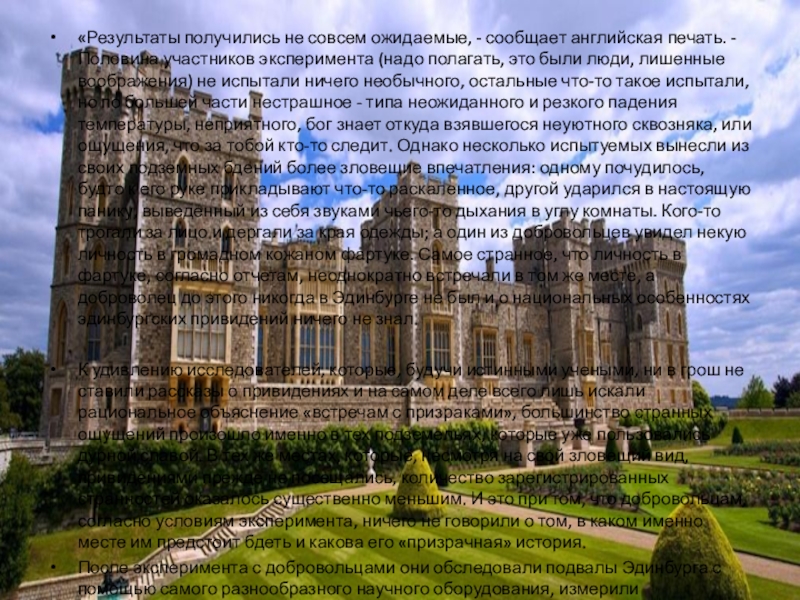 Тот же Ричард Вайсман с группой из 9 ученых проводил исследования и в Эдинбургском замке, богатом своей кровавой историей. В течение десяти дней 240 добровольцев со всего света пытались отловить призраков, отсиживаясь в подвалах знаменитого замка, где в семнадцатом веке была устроена тюрьма для пленных французских солдат, и в древних подземельях, расположенных в средневековом «Старом городе». Эдинбургские подземелья заинтересовали ученых, прежде всего тем, что именно здесь, согласно сотням отчетов, туристы и местные жители встречали призраков. В задачу добровольцев входило бродить по ночам по коридорам, подвалам и чердакам замка в поисках духов. При этом все происходящее в замке фиксировала сложнейшая аппаратура, способная ощущать электромагнитные изменения, выявлять воздушные потоки, температурные изменения, геомагнитные колебания, ультразвуки и прочее. Среди них главная роль была отведена цифровому сканеру стоимостью 50 тысяч долларов, который обычно используется полицией для поиска людей. Особое внимание охотники за привидениями уделили месту вокруг южного моста замка, где, согласно традиции, появляются призраки людей, похороненных там заживо во время эпидемии чумы. Кроме этих несчастных, в замке есть и другие привидения - призрак, играющий на волынке, мать с мертворожденным ребенком и другие духи. «Мы хотим установить, является ли все это наваждением или же правдой, - так объяснял цель эксперимента Ричард Вайсман. - В любом случае, это не станет потерей времени. Опыт позволит понять механизм, который приводит людей к вере в духов».2
