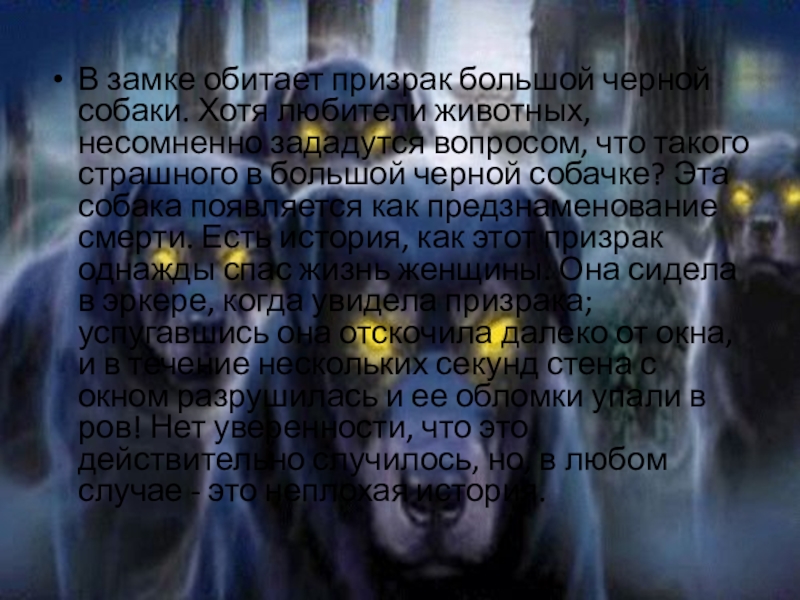 В замке обитает призрак большой черной собаки. Хотя любители животных, несомненно