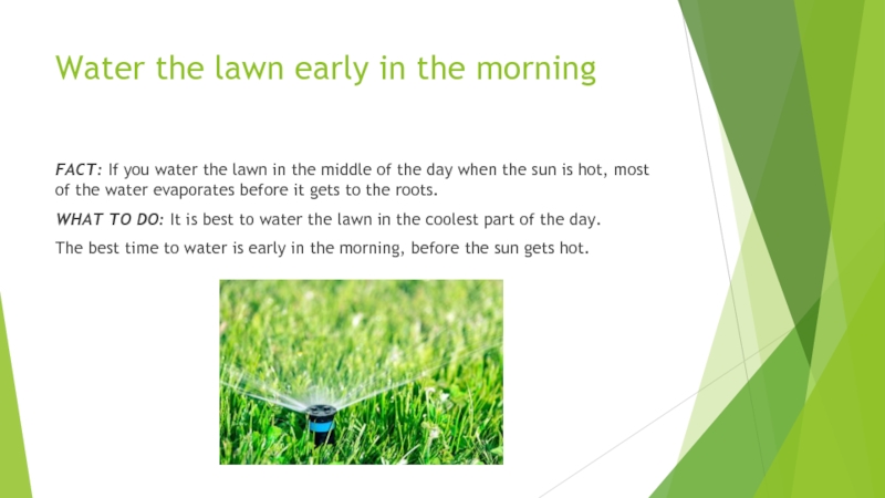 Слайд 11Water the lawn early in the morning